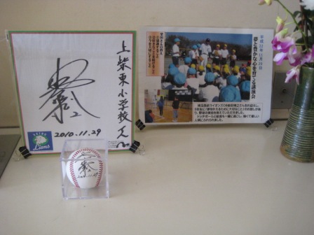 昨日講演された埼玉西武ライオンズOB柴田博之さんからいただいた、色紙とサインボールを玄関に展示しました。来校された際、ご覧ください。