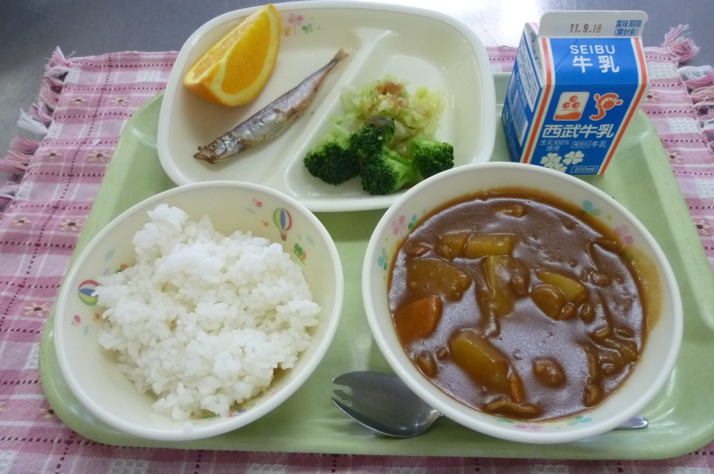 牛乳 ハヤシライス 焼きシシャモ 温野菜 オレンジ