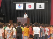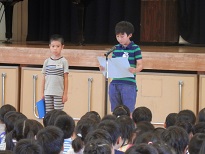本日一学期終業式を行いました。児童代表のあいさつでは、2年生と5年生の児童が一学期にがんばったこと、そして2学期にがんばりたいことを発表してくれました。