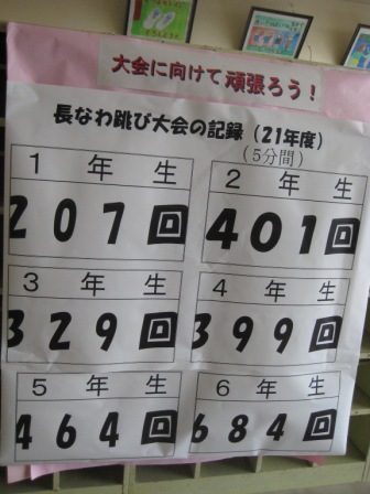先週の長縄跳び大会の結果を掲示しました。東西の昇降口に張り出された結果は練習の成果であり、クラスの努力であり、「練習はうそをつかない」を証明するものです。