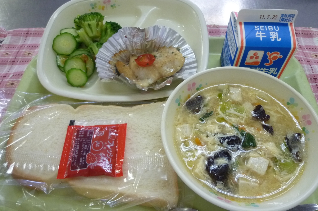 牛乳 山型食パン イチゴジャム 白身魚の香草焼き