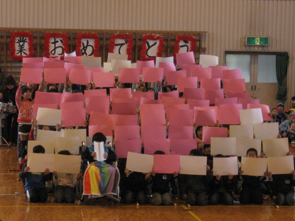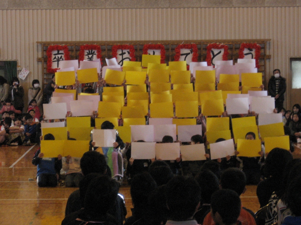 4年生は、お世話になった6年生に向けて、渋沢栄一の夢七訓の群読と歌やリコーダーを贈りました。また、感謝の気持ちをこめて、4年生全員でハートと星のマークを作りました。