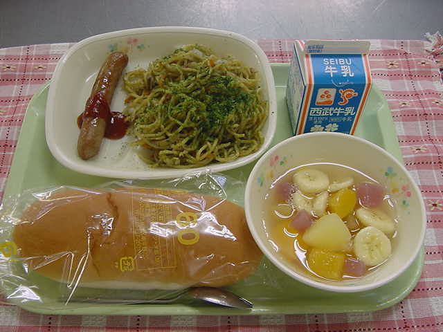 牛乳 バターロール  ソースやきそば フランクフルトケチャップあえ