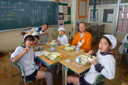 授業を見学後、子どもたちと一緒に給食を食べました。