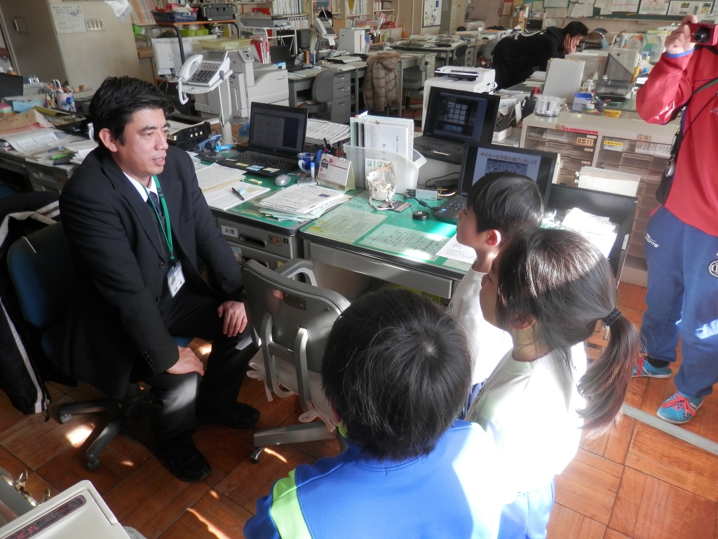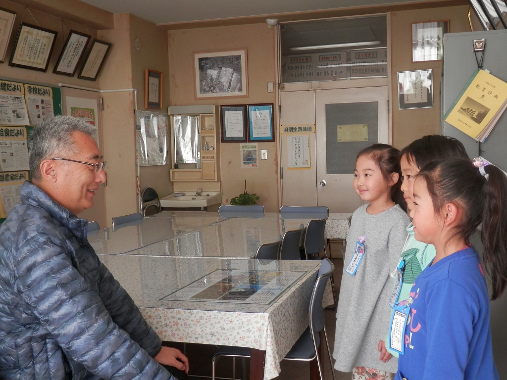1年生の国語の教材の一つとして、「学校のことをつたえあおう」という単元の学習で職員室にいる先生方に質問をしました。「好きな色は、何ですか。」「それは、どうしてですか。」「好きな歌は、何ですか。」「なぜ好きになったんですか。」「好きな映画は、何ですか。」「どうして好きになったのですか。」などの質問をしていました。しっかり質問ができていました。