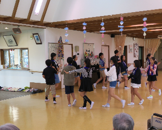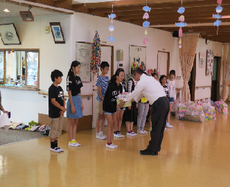 ボックスティッシュをお贈りし、返礼として図書を寄贈していただきました。図書室に収蔵し、活用したいと思います。子供達は深谷市歌と上柴音頭を披露して、お年寄りの皆さんに喜んでいただきました。