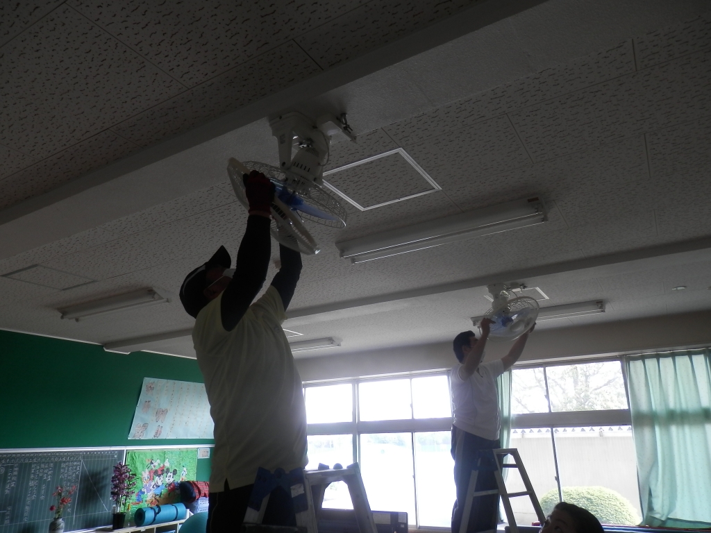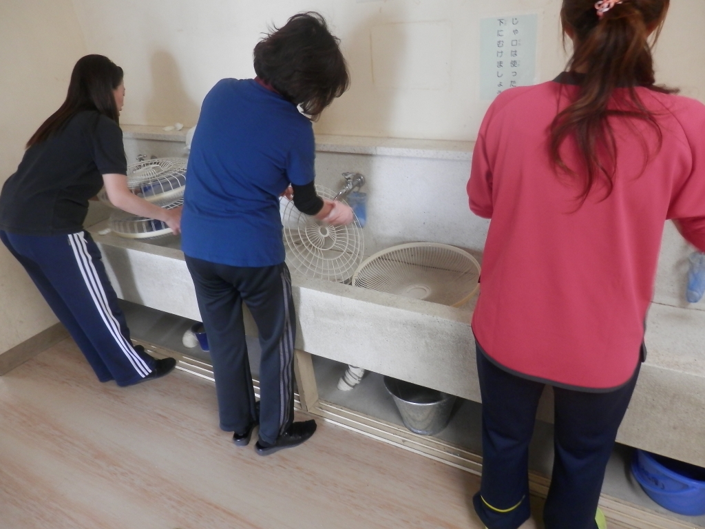 家庭訪問中に教務の先生方が各教室の扇風機の掃除をしました。1年経つとほこりが結構ついていてびっくりします。ファンの部分をていねいに洗っていました。子供達が快適な環境で学べることが大切です。先生方ありがとうございました。
