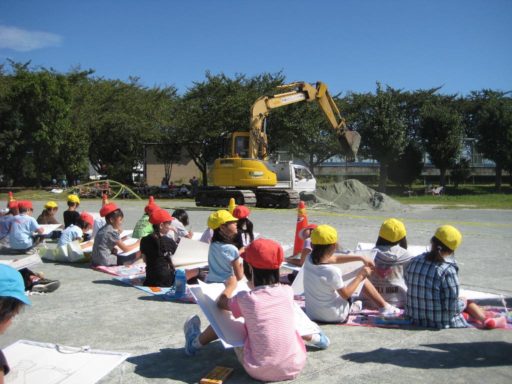 校庭の東側と斜走路を整備しました。バックフォーやロードローラー、ダンプカーなどの機械が入り、整備する様子を、3年生は写生会として描きました。斜走路は走りやすくなりました。