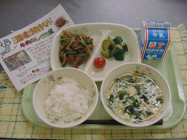 牛乳 ご飯 牛肉のしぐれ煮 きゅうりのごま味噌あえ
