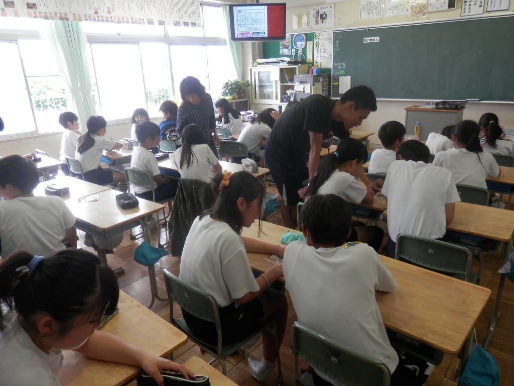 家庭科で栄養教諭の加藤先生が6年2組の授業をしていました。「いためて作ろう 朝食のおかず」が単元名です。朝食の大切さと3色の栄養素からおかずづくりを学んでいました。朝食を自分でつくり元気よく1日が過ごせるようになればと思います。