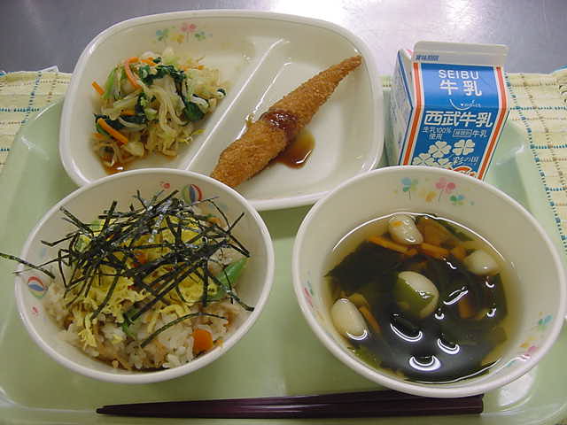 牛乳 ちらし寿司 シシャモフライ からしあえ すまし汁