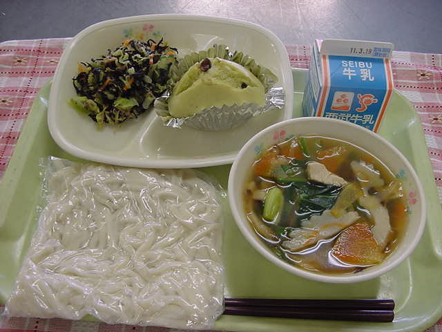 牛乳 五目うどん 抹茶蒸しパン ツナとヒジキのサラダ