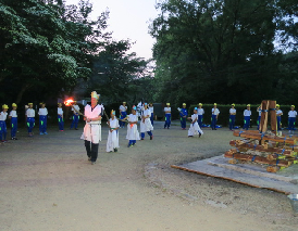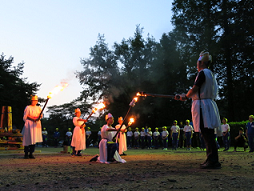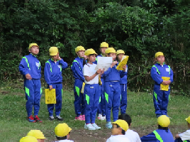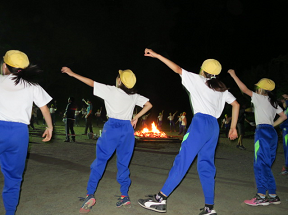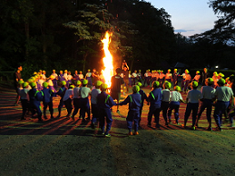 子供達が楽しみにしていたキャンプファイヤーの様子です。第1部「点火の集い」で、火の神と火の子が中央の薪に点火して、キャンプファイヤーが始まりました。第2部の「友情の集い」では、「マイムマイム」「ジェンカ」「ジンギスカン」などのフォークダンスやゲームで盛り上がりました。みんな笑顔いっぱいで充実感にあふれていました。第3部の「別れの集い」では、山の神に感謝を捧げ、静かにキャンプファイヤーが終わりました。
