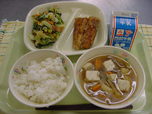 牛乳 ご飯 さんまのかば焼き 野菜炒め けんちん汁