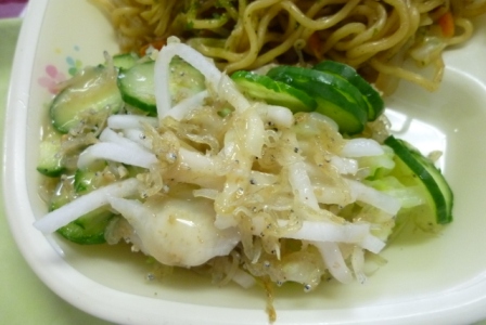 牛乳 メロンパン ソースやきそば ジャコと大根のサラダ