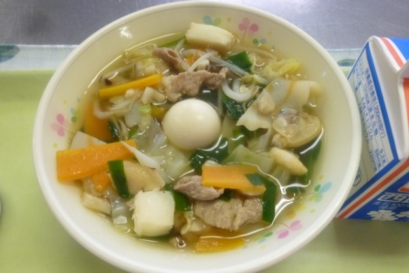 今日の給食では、ポークガラスープに魚介類と野菜を