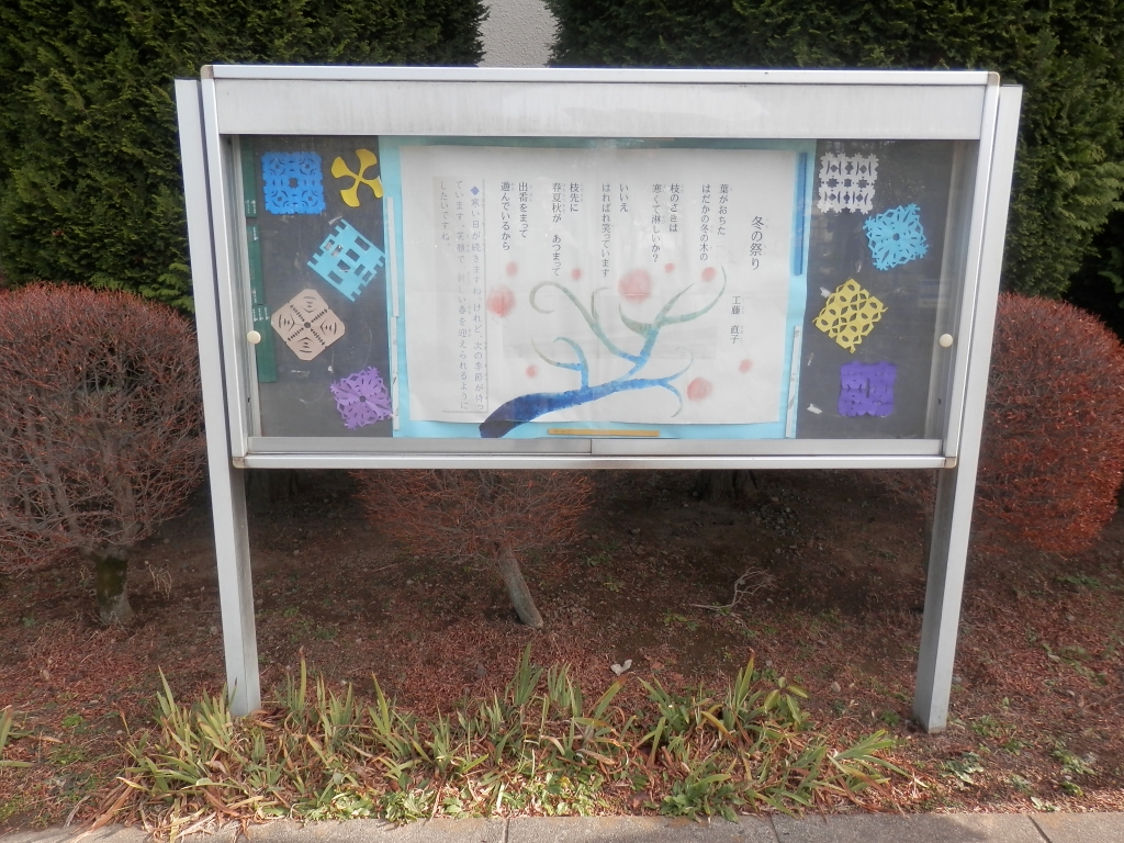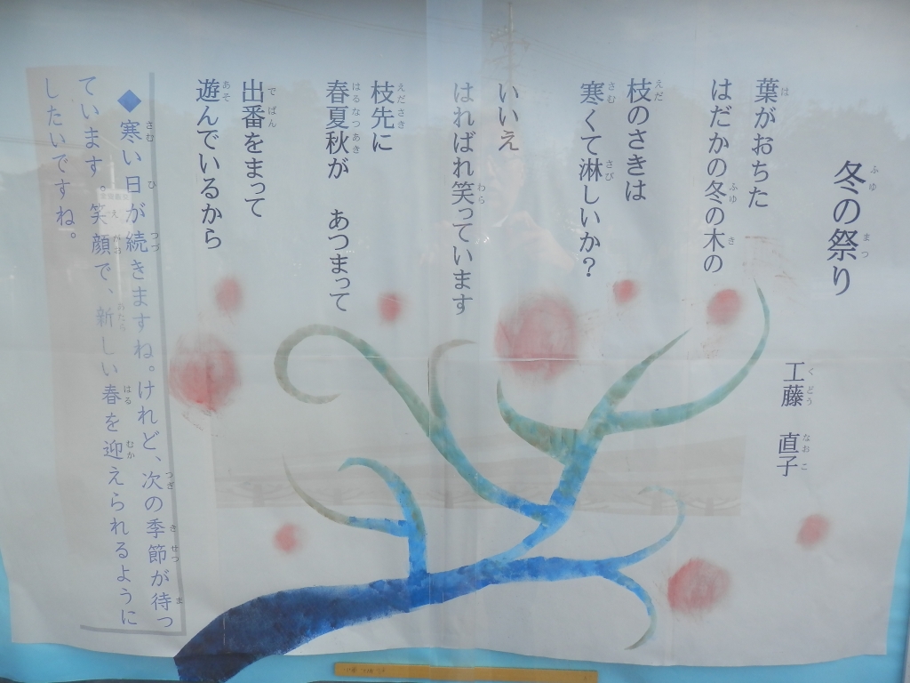 今月は、詩が掲示してあります。掲示されているのは、工藤直子作の「冬の祭り」です。子供たちは、毎月、低学年・高学年と違う内容の詩の暗唱に取り組んでいます。その低学年の今月の詩が「冬の祭り」です。心に残る詩を一生懸命覚え暗唱することは、大切なことだと思います。2学期も残り少なくなりました。まとめとして頑張ってほしいと思います。