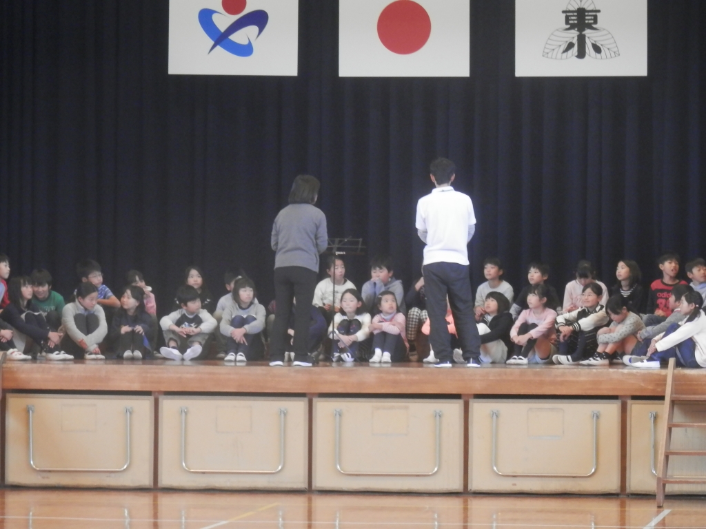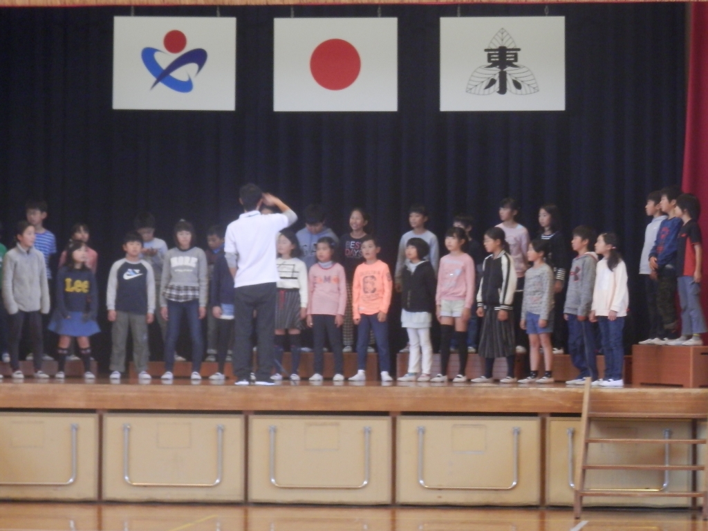 明日は、心なごむふれあい演奏会です。深谷市小学校音楽会に出場した4年1組の子供達が演奏します。指揮は、松本教諭です。体育館から美しい歌声が響いてきたので聴きに行きました。明日も響かせてください。