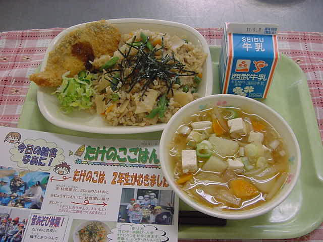 牛乳 竹の子ご飯 鮭チーズフライ 塩キャベツ