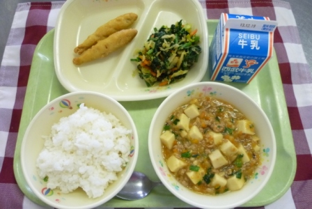 牛乳 ご飯 ワカサギの天ぷら ゴマ和え マーボー豆腐