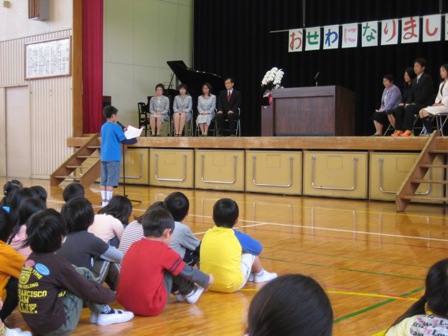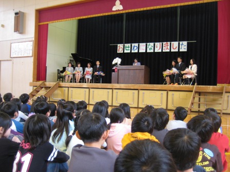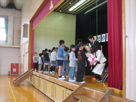退職・転任された先生方を招待し、第4校時に離任式を行いました。お世話になった先生方の紹介の後、児童会長によるお別れの言葉、代表児童による作文・花束の贈呈を行い、感謝の気持ちを伝えました。最後に、退職・転任された先生方8名から、子どもたちへの話をいただきました。その後、各教室で給食を一緒に食べていただき、交流を深めていただきました。