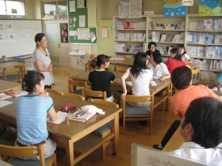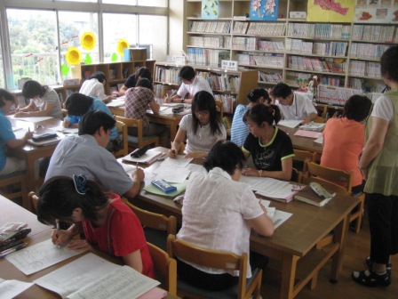夏季休業中は教職員にとって研修の期間ともいえます。本日は午前中に校内研修を行いました。写真は図書室での教育相談研修と英語スキルアップ研修での1コマです。