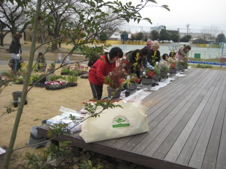 本日、「緑の王国」主催の寄せ植え教室が、おはなのひろばを会場にして行われました。クリスマスやお正月に向けての作品づくりに知恵と熱気があふれているようでした。