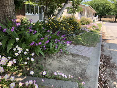 本校の学校応援団「グリーンプロジェクト」の皆様が手入れをしていただいている、会議室前の花壇の花が今が盛りと花を咲かせています。