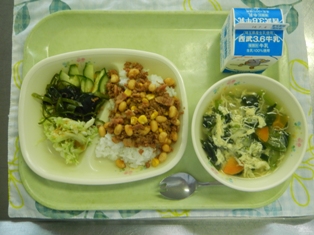 ソイ丼 牛乳 海藻サラダ ニラと玉子のスープ