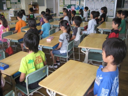 写真は、3年生の朝の会での「腰骨タイム」の様子です。両足をピタリと床に着け、おしりを思い切り後ろ、反対にお腹を前に、両手を太ももの上に置き、落ち着いた気持ちで1日がスタートします。