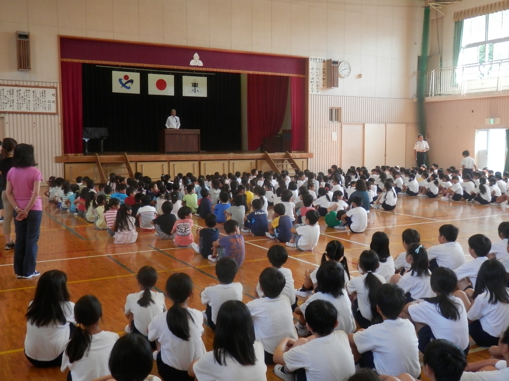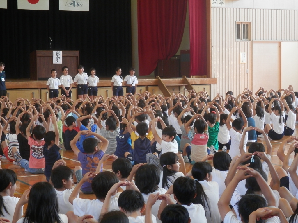 今日は、体育館で全校朝会がありました。学校教育目標の大きな柱の1つ「本気で学ぶ子」について話をしました。学習の準備をすること。人の話をよく聞くこと。よく考えること。発表することなど学校や家で取り組むことを子供達に話しました。その後、6月の生活目標について話がありました。「室内でのすごし方を工夫しましょう」です。安全に過ごしましょう。