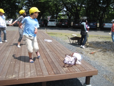 晴天に恵まれ、ウッドデッキ床下への砂入れと、ランチルーム前芝生の草取りを行いました。ウッドデッキには休み時間に、子ども達が歓声をあげていました。