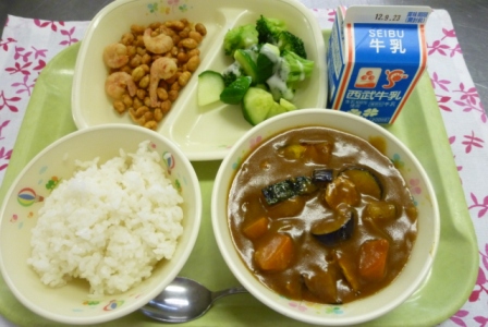牛乳 夏野菜のカレーライス 大豆と剣エビのカリカリ揚げ