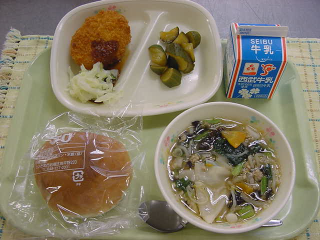 牛乳 コロッケサンド きゅうりのピリッと漬け ワンタンスープ