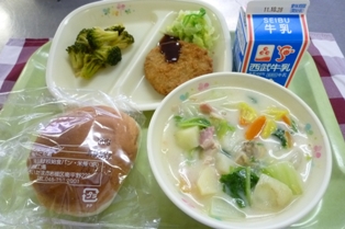 牛乳 子どもパン メンチカツ 茹でキャベツ クラムチャウダー