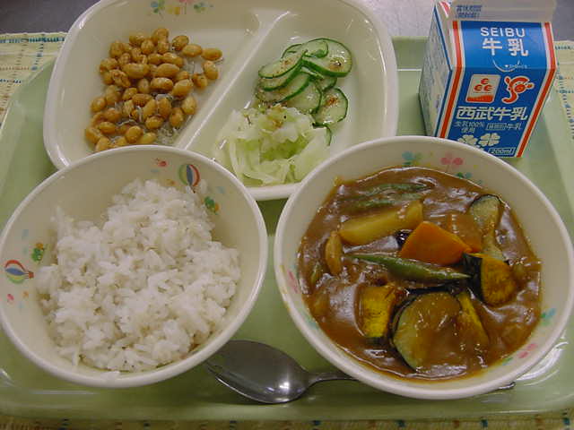 牛乳 夏野菜のカレーライス 大豆とじゃこのカリカリ揚げ