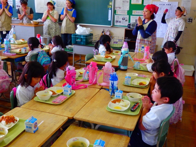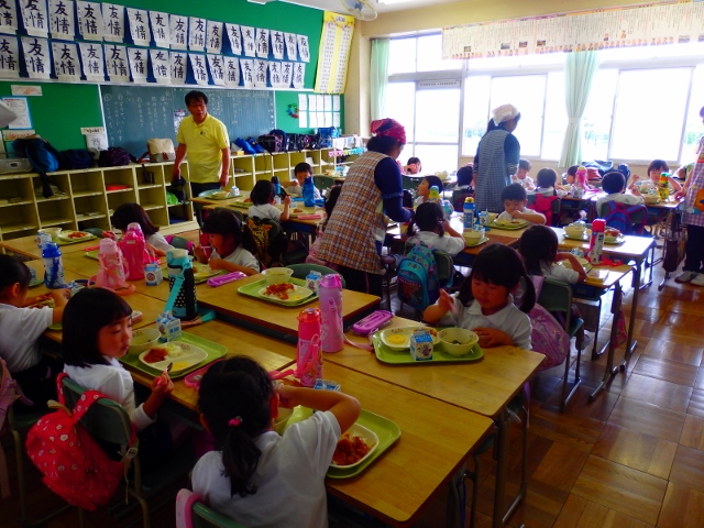 16日(木)は、上柴西幼稚園の園児達が来校しました。6年生は、修学旅行中なので6年生の教室を借りました。その6年生の教室で給食を体験しました。