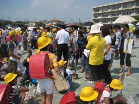 避難訓練に引き続き、保護者の方への引き渡し訓練を行いました。一人一人お迎えの方を確認をして子どもと一緒に帰路についていただきました。非常時の際の避難方法についてご家庭でもご確認くださるようお願いします。本日の訓練にご参加いただき、ありがとうございました。