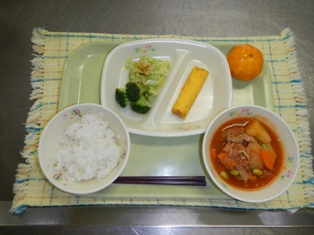 ごはん 牛乳 肉じゃがのトマト煮 厚焼き玉子 温野菜 冷凍みかん