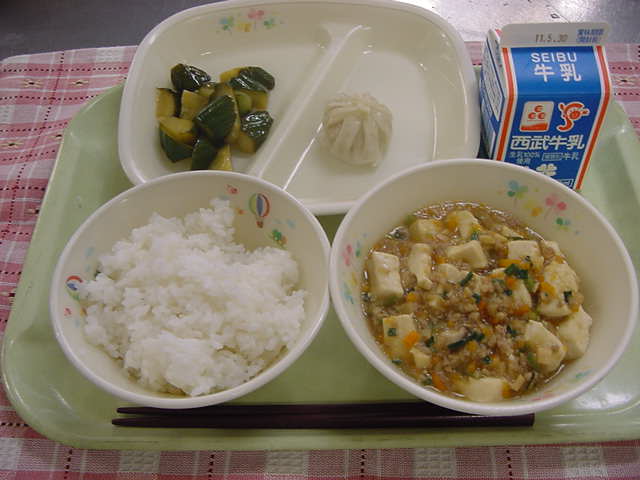 牛乳 ご飯 上海パオズ マーボー豆腐 中華きゅうり