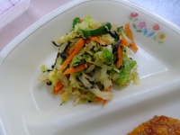 ごま油とお酢、しょうゆ、にんにくなどで作ったドレッシングを野菜にかけ、のりを散らしたサラダです。