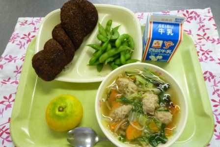 牛乳 ココア揚げパン 枝豆 肉団子と春雨のスープ