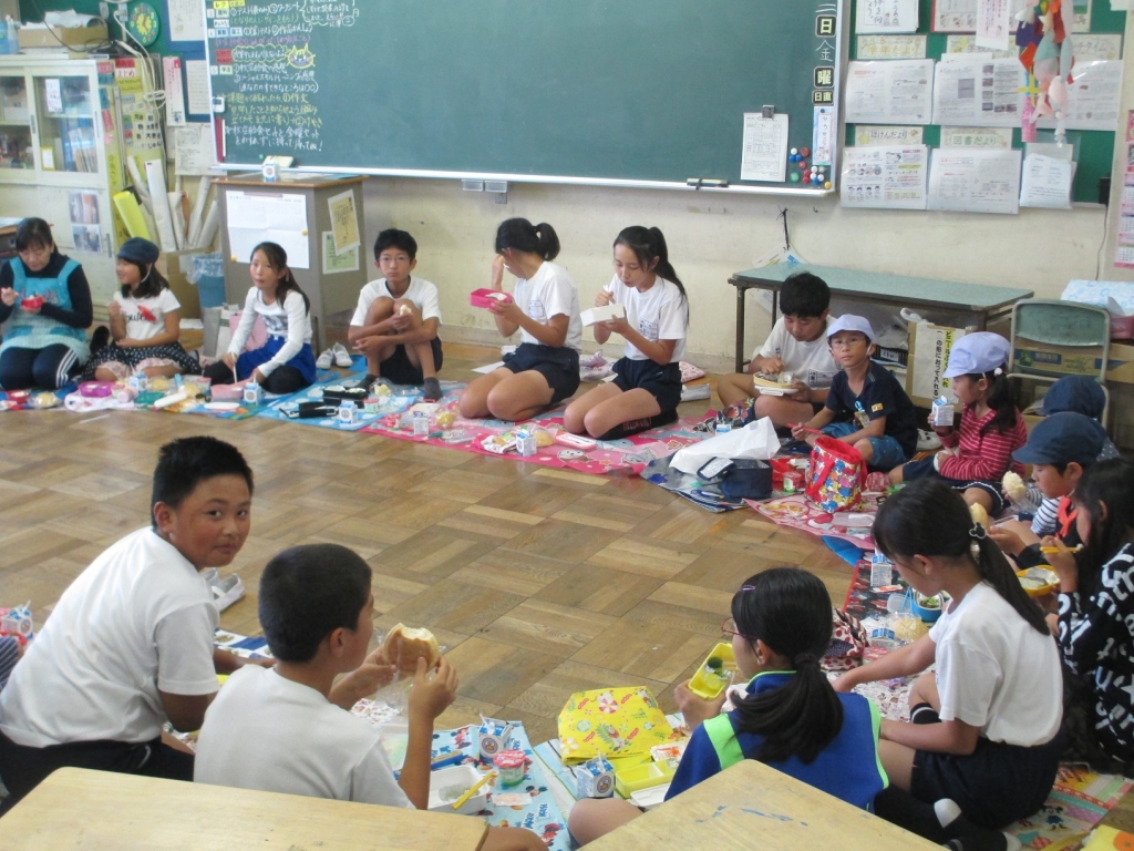 本日の給食は年2回の縦割り班で食べる『秋空給食』です。あいにくの雨模様でしたが、子供達は他の学年の子と一緒に美味しく食事をすることができました。また食事の後は高学年の子供達がリーダーとなって、それぞれの教室で工夫して遊びを楽しんでいました。