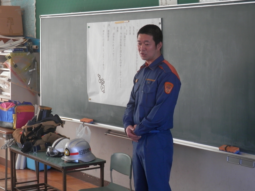 4年生の総合学習の一つとして1/2成人式があります。今日は、伊勢崎オートレース所属の清水 卓先生と児玉郡市消防本部の西 哲雄先生のお二人のお話を聞きました。子供たちは、集中して学習に取り組んでいました。将来何になりたかったのか。どんな夢をもっていたのか。など多くのことを知ることができました。ありがとうございました。
