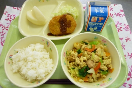 牛乳 ご飯 ポテトコロッケ・茹でキャベツ  野菜の卵とじ