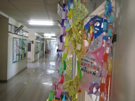 七夕集会で体育館を彩った七夕飾りの一部をを1階廊下に移しました。また、子ども達の願い事を書いた短冊は各クラスに飾っています。