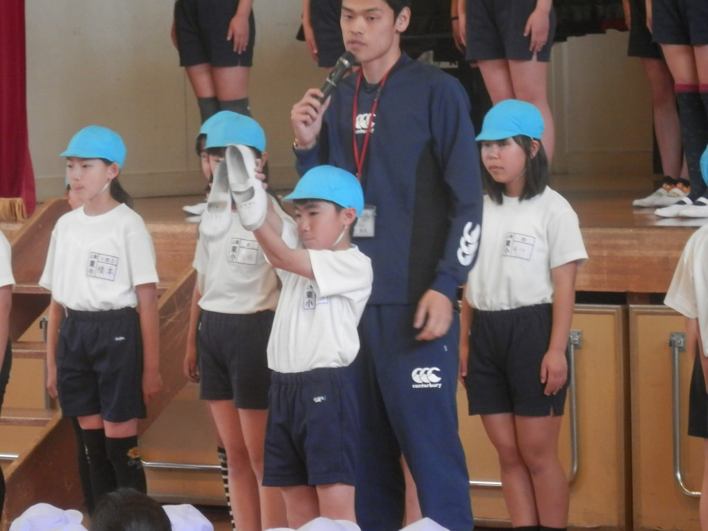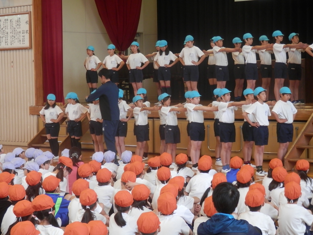 6年生が壇上で動きを示してくれました。これからしっかり覚えていきましょう。