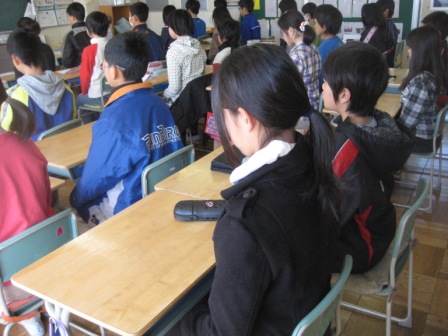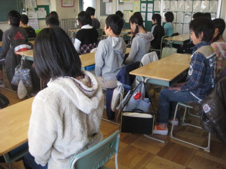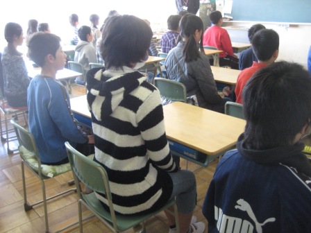 (下の写真は、6年生の朝の会における「腰骨タイム」の様子です。3月9日~11日撮影)