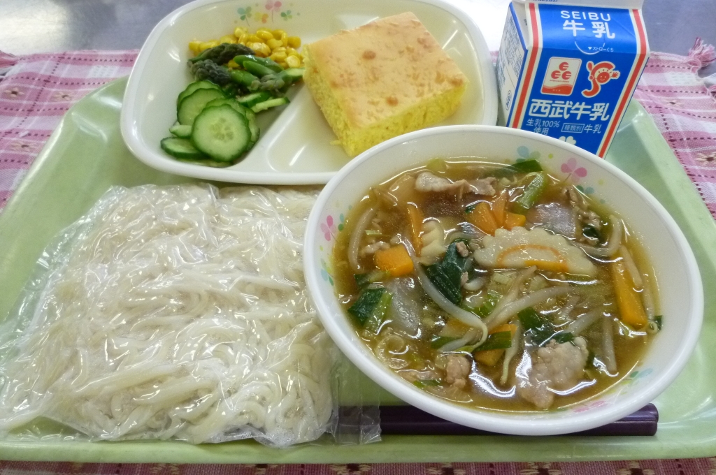 牛乳 広東麺 オレンジパンケーキ グリーンアスパラ入りサラダ