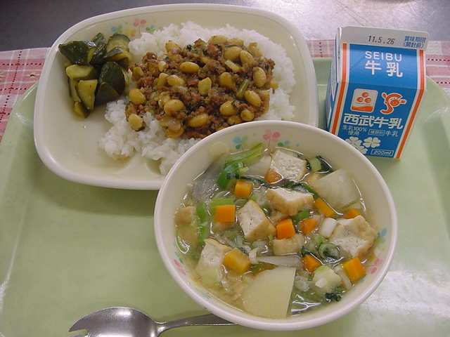牛乳 ソイ丼 きゅうりのぴりっと漬け 野菜椀